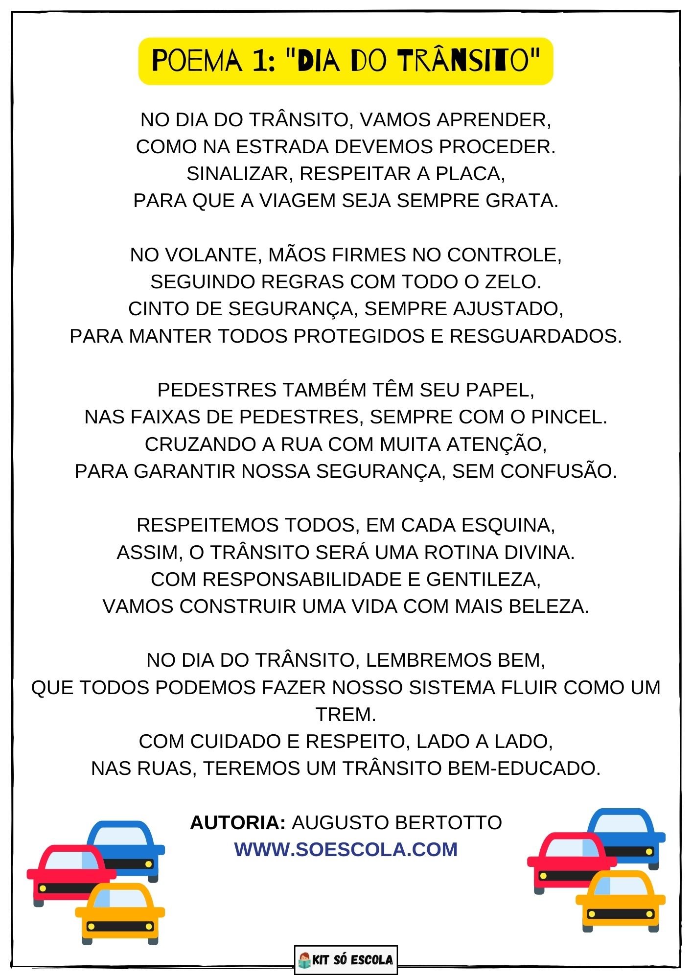 Para facilitar para vocês vamos disponibilizar a seguir os 6 poemas sobre o Dia do Trânsito pronto para imprimir: